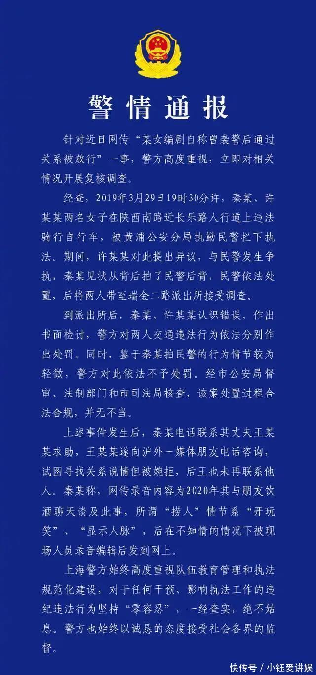 在舆论的持续发酵之下,上海警方也发布情况通报。通报显示,在一次交通违规处置过程中,秦雯曾拍了民警后背。但因为情节轻微,警方便做了不予处罚的决定。没想到这一次的“法外开恩”,竟成为秦雯的谈资。事后,其曾联系丈夫托关系,为其说情,但被拒绝。本以为这场风波就此画上句号,没想到经过秦编剧的一番构思,竟成为彰显自己神通广大的一个新剧本。而在警方介入调查之后,秦雯也坦言,所谓捞人情节,系“开玩笑”,以展示自己的不俗人脉。